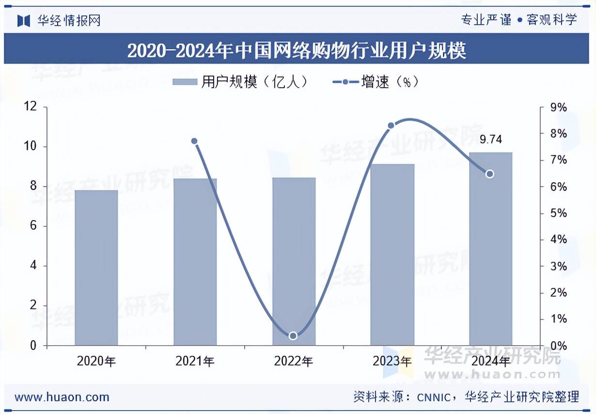 截至2024年12月,我国网络购物用户规模呈现出极为强劲的增长态势,达到了令人瞩目的9.74亿人。与2023年12月的数据相比,在短短一年间,新增用户数量就高达5947万人。这一庞大的用户群体,占我国网民整体规模的87.9%。数据的大幅攀升,彰显出网络购物在国内愈发普及,已然成为大众主流消费方式,持续推动着网络购物行业蓬勃发展。